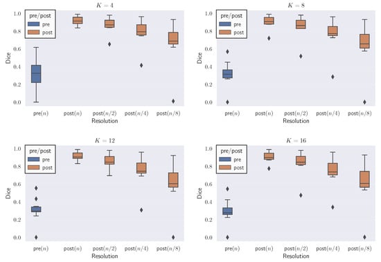 - In the second part of the search, we do a simple reduction search for by fixing = . Starting with a given value , we reduce by one order of magnitude and repeat solving the registration problem with and the respective value for until we reach . We put a lower bound on in order to minimize computational cost. We take the last valid value of , for which the Jacobian determinant was within bounds and denote it as . We fixed the value of for all experiments and resolutions. We determined this value empirically by running image registration on a couple of image pairs at resolution and (see Section 5.4 for the images) for different values of . We report these runs in Table A1 (see Appendix B).