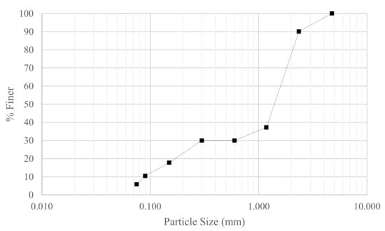 The granular material was prepared from high purity fused silica (HPFS) with specific gravity, Gs = 2.2, and was comprised of a bimodal mixture of grain sizes, with 70% between 0.85–3 mm and 30% silica fines ranging from 150 μm to <75 μm. The grading curve is shown in Figure 1. Maximum and minimum void ratios were determined as 1.280 and 0.861, respectively.