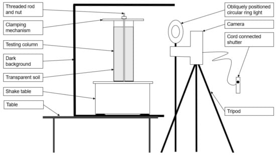 The glass column was clamped to the shaking table using a rubber padded timber top plate. The shake table and column were placed within a 5-sided black timber box, which provided a black backdrop and limited the light exposure to the back and sides of the soil column. A Canon EOS50 DSLR camera was mounted at mid-height of the column and isolated from the shaking apparatus to minimize vibrations from the shaking table. Care was taken not to disturb the placement of lighting and cameras as the column was removed and replaced between trials, as this would have necessitated a re-calibration of pixel intensity. A schematic of the experimental setup is shown in Figure 2.