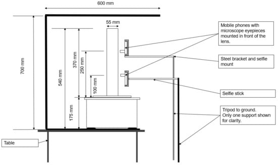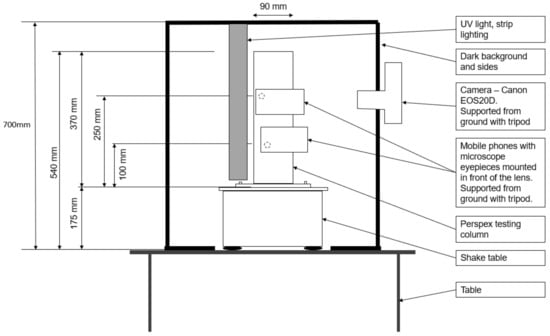 Three cameras were used to photograph the experiment. Two macro images approximately 10 mm in diameter were taken at elevations of 10 cm and 25 cm. Two smartphones with microscope eyepieces at x10 magnification were mounted in front of the phone cameras to view the 45–53 μm particles. The open-source mobile camera application OpenCamera [] was used to take an image every 5 s. The lenses were placed approximately 5–10 mm away from the Perspex column surface. Each view was framed on one side with tape annotated with graduations to determine the pixel-to-mm scale during post-processing.
