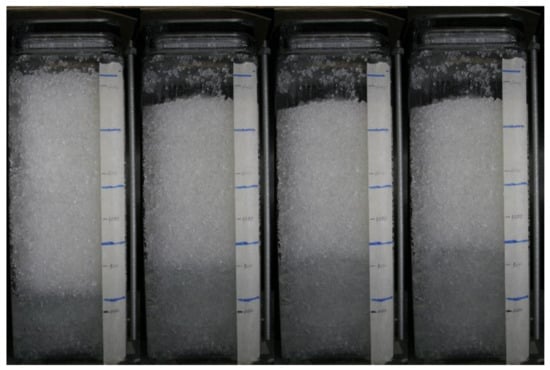 Sills et al. [] described column experiments in which changing transparency was used to measure the degree of saturation as the head rises or falls. However, these experiments used fused silica and a mineral oil with a viscosity 10 times that of water. To correctly model transient flow that would occur during cyclic column loading, a fluid with a viscosity closer to water is required. Previous investigations have identified pore fluids with a low viscosity [,], but these are either expensive or present health risks, and alternative pore fluids that are both low cost, stable, and widely available are desirable.