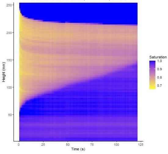 Upon initial analysis of the uniformly saturated Test 2, a ‘bulge’ in pixel intensity was found along the height of the column due to the location and shape of the ring light. A subtraction array was determined during post-processing to correct for the uneven illumination. Average pixel intensities were normalized then converted to saturation using the relationships proposed by Sills et al. []. Average pixel intensities were normalized as follows: