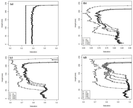 Saturation profiles at different times during the unsaturated tests (a) test 2, (b) test 3, (c) test 5, and (d) test 8.