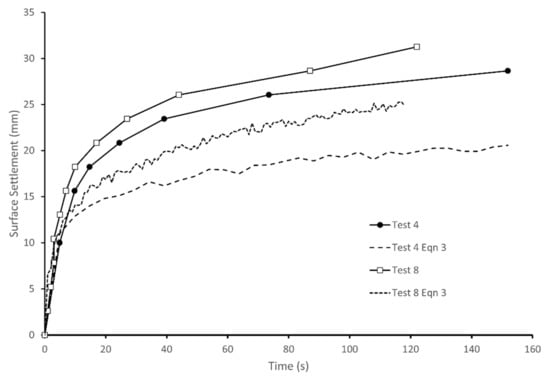 Surface settlements measured in tests 4 and 8 and estimated from changes in S.