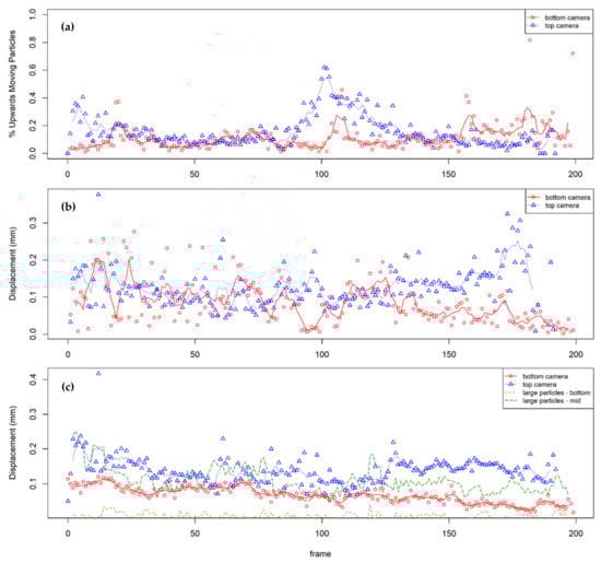 Analysis of average particle movement between successive photos: (a) % of upwards moving particles, (b) average upwards displacements, and (c) average downward displacements.