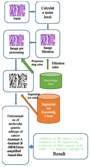 In [,], the approach to automatic biomedical image segmentation using U-Net convolutional neural network technology is presented. However, in this case, taking into account the specifics of immunohistochemical images, a different approach to segmentation was chosen. An adaptive method of biomedical image segmentation based on metrics was developed in []. This approach uses the rules based on segmentation algorithms. In [,,,,,], strategies to analyze biomedical images based on data processing algorithms are presented. The research findings demonstrate approaches to the development of adaptive methods of cytological and histological image preprocessing and segmentation based on fuzzy logic. However, there is a need to develop alternative methods of immunohistochemical processing and the automatic identification of the cancer subtype based on the obtained indicators.