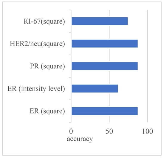 Figure 3 shows the original image and the generated mask, reflecting the areas of interest. The image is the mask generated automatically without human intervention based on the developed adaptive algorithm of image preprocessing. As can be seen from Figure 3, the studied images were not of the same type. With automatic diagnosing, many calculations were performed on several images. Relative area and cell intensity were used to assess the accuracy of the developed method of preliminary diagnosing. Figure 4 shows the ratio of the correctly defined parameters (area, intensity) to the total number of images in the study. To determine the subtype “Luminal A”, one of the conditions was to calculate the area of cells in the image processed with the biomarker “progesterone”.