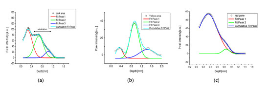After this preliminary characterization of the real fresco fragments, we concentrated our attention on the PA stratigraphic analyses. The experimental results were derived from an average of 20 depth profiles of the three different samples, obtained by ImageJ. To obtain the depth profiles we fitted the experimental data with Lorentzian and Gaussian functions, as displayed in Figure 4. From stratigraphic images of Figure 4, in comparison with Figure 2, we excluded the signals derived from a thicknesses below 1 mm of depth, from our analysis, because they were probably spurious signals due to the reflection of PA waves in the substratum. This assumption was confirmed by a detailed study of mock-ups realized with different bases (see next paragraph). As revealed by the deconvolution procedure in Figure 4a, the L1 painted line was composed of three layers of 60, 71, and 137 μm, respectively with a maximum error of 25%.