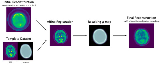 The attenuation map (µ-map) computation consisted of three steps: template preparation, PET-to-PET registration, µ-map deformation (Figure 2). All volumetric image registrations and deformations were performed with the open-source software Nifty-Reg [15,16], which uses a coarse-to-fine block matching to perform rigid and affine registrations. Alternative methods for registration were not investigated yet, but could be of interest [17,18,19].
