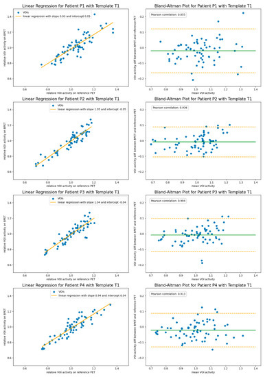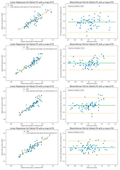 Figure 5. The VOI comparison of reconstructions using the independent template µ-map T1 for the attenuation correction with reconstructions from the reference PET/CT system. In the left column are the linear regression plots. Shown in the right column are Bland–Altman plots indicating the 1.96 SD bars (orange) at either side of the mean intensity ratio (green).