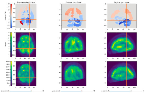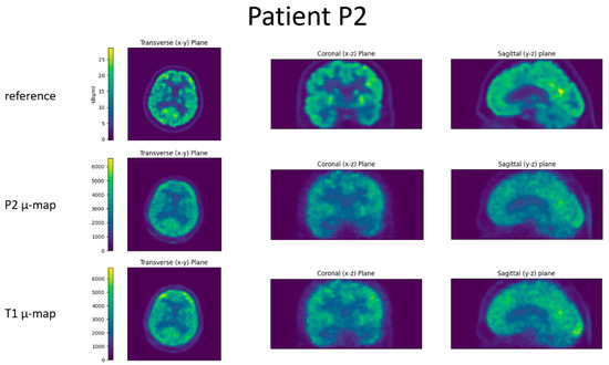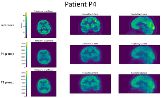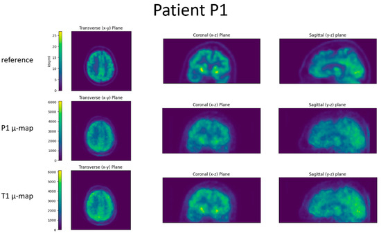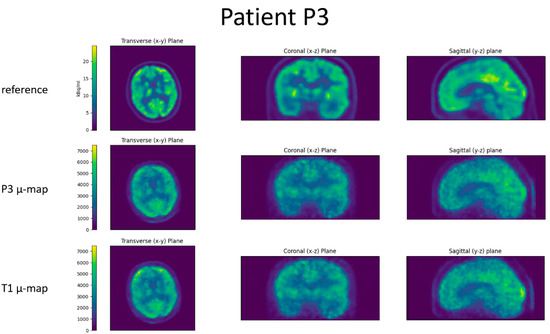 For all four patients, the reference image, the reconstructed BPET image with the patient-specific µ-map, and the reconstructed BPET image with the µ-map computed from the independent T1 template dataset are shown in Figure 6, Figure 7, Figure 8 and Figure 9. In these figures, the reference images are not smoothed. The BPET images are smoothed by a median filter with kernel size 3 × 3 × 3 to reduce the salt and pepper noise.