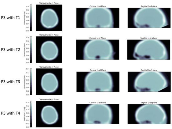 Figure 11. The attenuation maps obtained for patient P3 with the four templates. It is clearly visible that a part of the neck is not covered by the reference PET/CT scan of template T3 (and to a lesser degree also of template T1), and therefore results in a gap in the attenuation map.