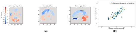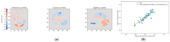 Figure 14. This figure shows the relative VOI deviations when using template T4 for patient P3. As in Figure 13, the left and right gyrus rectus VOIs experienced the largest deviations (a). However, these two VOIs with the highest deviations are less pronounced than in Figure 13, as also noticeable on the linear regression plot (b).