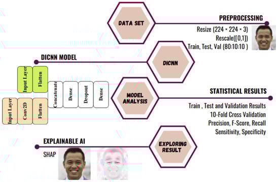 The bottom-line integrant of the DICNN-XAI approach is: the DICNN model for auguring fake face images and the SHAP-based explanation framework. Figure 2 is the diagrammatic representation of the overall process followed. StyleGAN-generated doctored face images are pre-processed to feed multiple copies into the DICNN model. After the different statistical results of the model are analyzed, it is finally fed into SHAP to explore the blackbox approach of the DICNN model.