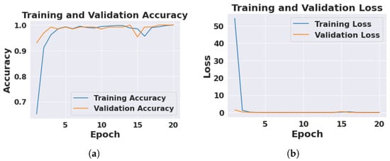 Train and validation results of 10th fold from proposed DICNN. (a) Depicts 99.36 ± 0.62% training accuracy and 99.30 ± 0.94% validation accuracy. (b) Conveys 0.19 ± 0.31 of training loss and 0.092 ± 0.13 of validation loss.