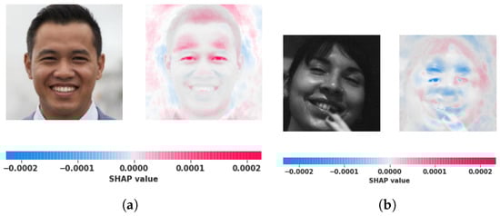 Considering fake and real categories, (a) shows the SHAP results for a fake image, whereas (b) shows the SHAP results for a real image.