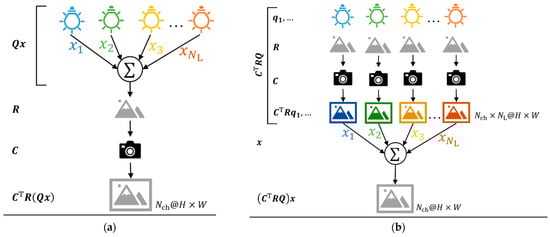 The observed features: (a) The image was measured under the accumulated (mixed) spectral power distribution (SPD) of sub-SPDs with the intensities of . (b) Images were measured for each sub-SPD, then synthesized into one image by multiplication with the linear weights, . Equivalence was achieved between the case observed under the accumulated spectral power distribution (SPD) and a linear synthesized variant of the observed features under each sub-SPD. Considering that the observed features that were measured under the accumulated SPD ( ) and the synthesized features, after measuring under the sub-SPDs ( ), are the same, from Equation (3), the images in (a,b) are the same if lighting weights, are the same as each other and measuring the images by camera has linearity.