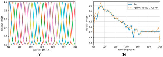 (a) The simulated sub-light source: each spectral distribution was computed by assuming a Gaussian distribution with a full-width at half maximum (FWHM) wavelength, , and its means are 412, 437, 462, 487, 512, 537, 562, 587, 612, 637, 662, 687, 712, 737, 762, 787, 812, 837, 862, 887, 912, 937, 962, and 987 nm. (b) The approximation of the D65 standard illumination spectral distribution with band-adjusted sub-light sources is represented in (a).