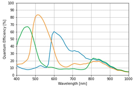 To simulate the observation of the illuminated object, the spectral sensitivity of an RGB camera (AR1335; ON Semiconductor, Phoenix, AZ, USA) was used as the image sensor (Figure 8).