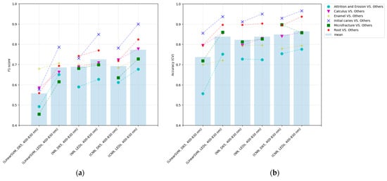 The one-vs-rest classification was used to classify the classes of the input image using 1-pixel or patch images for the healthy enamel portion of the tooth and the attrition and erosion, calculus, initial caries, microfracture, and root lesions, respectively.