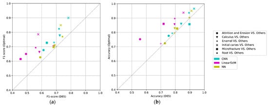 The comparison of performance between the reference (D65) vs. the optimal light in the five-fold cross-validation: alternating optimization (linear SVM), proposed method with only FCL (NN), and proposed method with CNN (CNN): (a) F1-score and (b) accuracy.