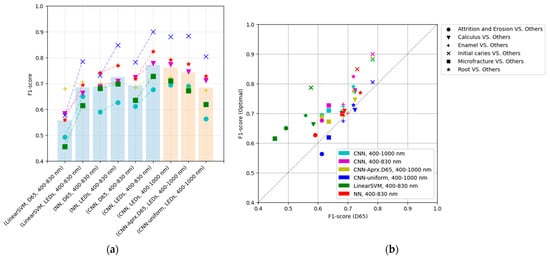The performance of each method of the band-aligned SPD utilizing the NIR in the 400–1000 nm band with the proposed method with CNN: (a) F1-score for each method, and (b) comparison of performance between the reference (D65) and the optimal light. In the three models utilizing the 400–1000 nm band, the lighting weights were initialized in different ways: randomized in [0,1], approximating D65, and as uniform vector 1, respectively.