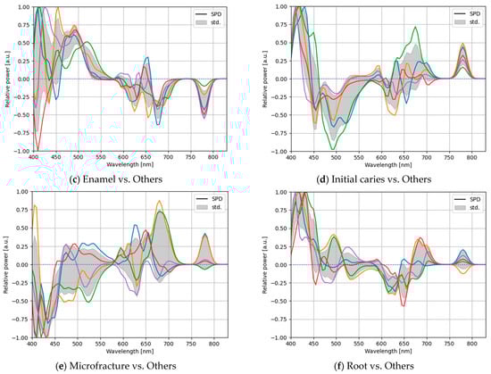 The optimal SPDs of the CNN-based optimization in a five-fold cross-validation with the measured LEDs having spectral powers in the 400–830 nm band for each classification of one-vs-rest classification: (a) attrition and erosion vs. others, (b) calculus vs. others, (c) enamel vs. others, (d) initial caries vs. others, (e) microfracture vs. others, and (f) root vs. others.