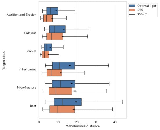 where denotes the data matrix for samples of class , and denotes a feature vector of -th sample of class . The feature space has dimensions in the case of the CNN-based classification from a patch image with three channels of RGB. The comparison of the Mahalanobis distances between the proposed CNN-based method and the D65 without optimization is shown in Figure 14. The distances are more significant for the result of the optimal lights with the CNN-based method than the D65.