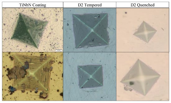 There are different methods to modify the hardness of the material, either by heat treatment such as quenching or tempering to modify the microstructure [11,12] or by depositing thin film coatings on the surface of the base material. Among the most commonly used coatings in the industry are Titanium Nitride (TiN) and Niobium Nitride (NbN). In the present work, D2 steel samples with different heat treatments and steels with Titanium Niobium Nitride (TiNbNx) coatings were used, which are employed for industrial applications as a cutting tool [13,14,15].