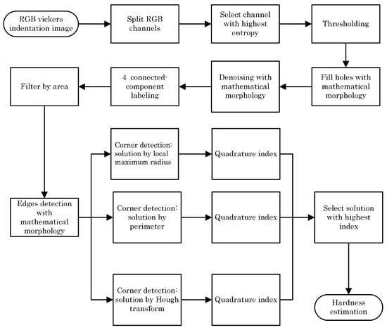 As shown in Figure 3, the indentation images have poorly defined edges and corners. In addition, there are elements (noise) in the background that do not correspond to the object of interest, which affects its detection, so the result depends on the perspective of the observer. Therefore, to improve accuracy and reduce measurement time and result variation, a method based on image processing and computer vision is proposed that automatically detects indentation and estimates the Vickers hardness value. The flowchart describing the process is shown in Figure 4.