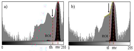 Initially, the highest value of the histogram is searched for, which allows for identifying the mode () corresponding to the background. Since the mode corresponding to the ROI is below , and is distinguished from by a local minimum that appears between them, this value is identified as the upper threshold () of the mode (see Figure 5a). In other histograms, the ROI is much smaller and no mode corresponding to it appears. In this case, the threshold is detected by the change of slope, as shown in Figure 5b. The low threshold () is located at the point where a new slope change is found. Once the image has been segmented, some holes are visible in the ROI, to fill them, a mathematical morphology method called fill holes is used (see Figure 7).