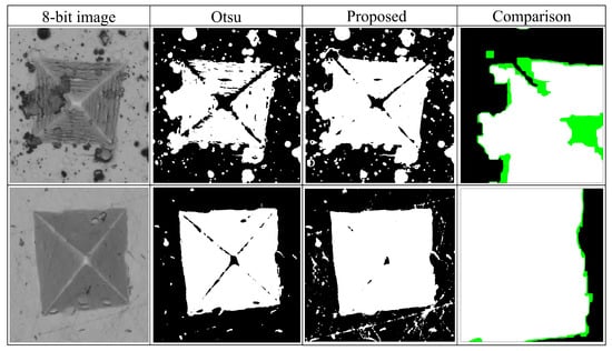As already mentioned, manual measurement is prone to errors because the results are variable and depend on the observer, the condition of the samples, the difficulty in detecting corners, and the number of measurements to be performed. The time required to determine the hardness manually is an estimated 4 min per sample, including the identification and measurement of the diagonals under the microscope and the determination of the hardness. The proposed method reduces the measurement time, has no variable results, and can be adapted to perform multiple measurements from the images of the indentation marks. The proposed thresholding method allows for good indentation region separation to be obtained in most cases, but it can fail if the acquisition protocol used is inadequate, producing poorly focused images, shadows, or the region of interest being too small with respect to the background.