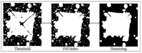 Due to the fact that heat treatment processes were applied to the material, the image shows stains in the indentation zone, which translates into noise or unnecessary elements in the zone of interest (ROI). In order to reduce this noise, mathematical morphology techniques based on erosion and dilation operations were used, performing an opening process in order to obtain the lowest possible noise without modifying the shape and size of the indentation mark as seen in Figure 7.