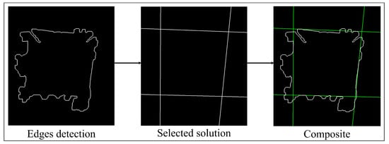- Solution by Hough transform: this solution has the advantage that the pixels do not need to be contiguous to determine a line; therefore, it favors the detection under a certain level of noise. It also does not limit us to obtain a single solution as in the case of a linear regression; with this transform, multiple lines can be drawn by adjusting to the irregularity of the object of interest [26].