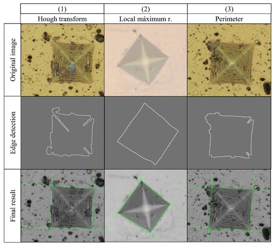 The indentation mark can take different shapes depending on the type of material and the force exerted on it by the indenter. Due to this, in many cases, it is not possible to approximate the shape of the indentation to a square. Therefore, three solutions are proposed to detect the corners of the indentation: