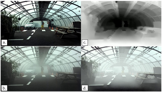 Example of an image with clear weather, real fog, and numerically simulated fog. The depth map is shown as an illustration of the stereoscopic outputs. (a) The initial image acquired in clear weather. (b) An image taken under the same conditions (pedestrian outfit and position) but with real fog generated with the PAVIN fog and rain platform. (c) The depth map, one of the crucial parameters for numerical fog simulation, the depth map comes from the output of the stereoscopic camera. (d) The corresponding image with the numerically simulated fog based on the (a,c) images data.