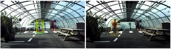 The precision–recall curve is then calculated based on the results of intersection over union values. The curve shows the trade-off between precision and recall for different confidence threshold values from the YOLO algorithm. As an example, the different detections obtained by the YOLO algorithm, for different levels of confidence, from 0.3 to 1, on two images from the database, are presented in Figure 5. The left image of Figure 5 shows the 9 YOLO labels with two labels far from the pedestrian present in the scene, yet for one of them a confidence value greater than 0.5. The image on the right shows labels well-centered on the pedestrian, but with a high variability of the confidence value ranging from less than 0.5 to more than 0.9.