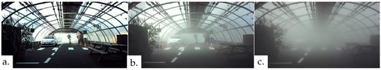 Three weather conditions for a daytime configuration of the scene with (a) clear weather CW, (b) medium fog MF, and (c) dense fog DF.