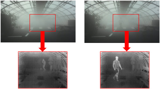This section presents the main features of the Cerema Foggy-Twin Pedestrian database. This database contains real data, of different pedestrians (winter vs. summer clothes, light vs. dark clothes, accessories of different sizes, etc.), walking through an urban scene in day and night conditions, in clear weather, or in foggy conditions (Figure 6). In addition to real data, the database includes digitally simulated fog data and manual pedestrian labeling for both visible light and infrared thermal cameras. All these features are described in the following sections.