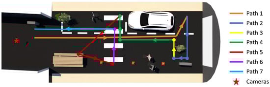 For each trial, the pedestrians follow the same path through the platform and repeat it twice, consecutively, to ensure repeatability. Following the different colored lines in Figure 8, the path allows the pedestrian to be presented from the front (paths 4 and 7), the back (path 1) and the side (path 2, path 3, path 5, and path 6), in relation to the camera position (the red star in Figure 8). In addition to walking at a moderate pace, the pedestrians also find themselves sitting on the bench at the picnic table.