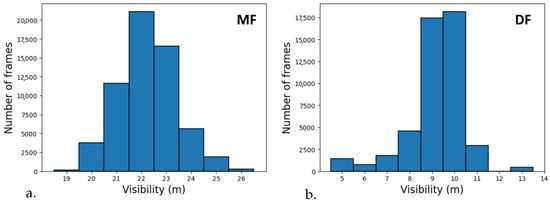 Visibility variability of MF (a) and DF (b) conditions during the tests in the PAVIN fog and rain platform.
