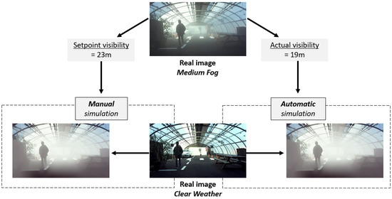 Finally, this work aims to verify the representativeness and realism of the output images of a widely used fog model. This model, called the Koschmieder model [28], consists of reproducing the visual effect of fog on fog-free images by applying a reduction of contrast. It is commonly used in today’s simulators [16,17,18], but some studies show that it has important limitations [15]. This type of validation remains rare in the literature [15]. The Koschmieder model is used here in the hardware-in-the-loop mode, using the images of the camera without fog, to add fog to it.