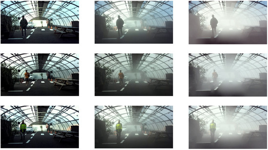 These MOR values were chosen to obtain critical fog conditions. Thus, it is certain that these conditions will challenge the detection algorithm. Subsequently, the scores obtained by the latter will drop down, which will allow us to check whether the scores are similar for physical fog and numerically simulated fog. Figure 6 shows an example of the images obtained for the three weather conditions of the real data.