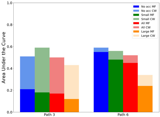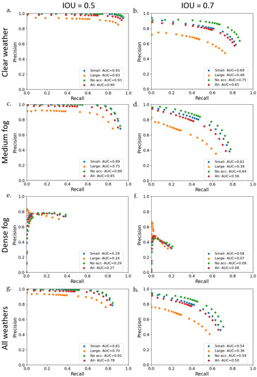From the results presented in the previous section, it has been decided that for the simulation of fog, using a noise model based on the Koschmieder law, only 1 frame out of 20 of each sequence of clear weather is processed. It allows us to reduce the amount of data without losing information. The scores are grouped in Table 6 with the AUC values of both artificial and numerically simulated medium fog. The relative deviation values are representative of the deviation of the AUC of numerically simulated fog compared to the artificial medium fog from the tests. If we first compare the two types of fog, we observe that in both cases, the scores of the numerically simulated medium fog are lower than those of the artificial fog, ranging from −7.8% to −13.1% for the “Automatic” configuration and from −6.2% to −11.5% for the “Manual” configuration depending on the accessory size. The lowest relative deviations correspond to pedestrians without accessories, while the highest relative deviations correspond to pedestrians with accessories, whether small or large. If we now compare the scores of both “Manual” and “Automatic” simulation modes, the numerical simulation with a fixed value of visibility (i.e., “Manual”) obtains lower relative deviations by 2–3 % than for the simulation with a visibility value extracted from the tests. This reinforces the negligible impact of the variability of visibility values of the fog produced within the PAVIN fog and rain platform.