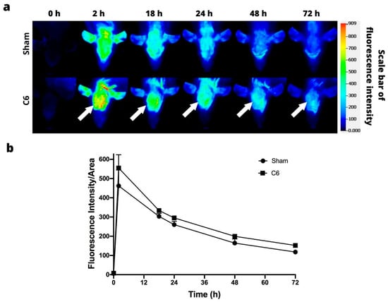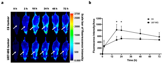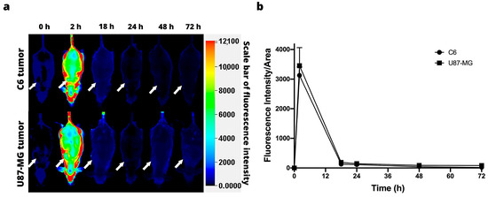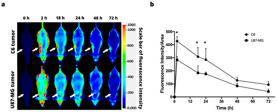 Figure 4a illustrates the images acquired with the Odyssey Infrared Imaging System (LI-COR) at 0, 2, 18, 24, 48, and 72 h post-injection of IRDye 800CW-2-DG in the animals of the C6 and U87-MG xenograft models. Since the fluorescence signal was intense at 2 h post-injection, its distribution being uniform throughout the bodies of the mice, the tumor area could not be differentiated for either cell line (Figure 4b).
