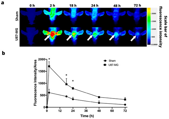 Figure 5. In vivo fluorescence imaging of IRDye 800CW RGD uptake by U87-MG intracranial glioma cells. (a) Fluorescence imaging of nude mice with an orthotopic U87-MG tumor. The position of the tumor is indicated by the white arrows. (b) Fluorescence intensity as a function of the time elapsed after the U87-MG xenografts were administered or the sham operation performed. Values represent the mean (n = 3) ± SD. * A significant difference (p < 0.05) between Sham group with implanting of glioma cells U87-MG.