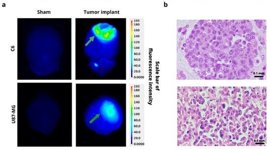 Figure 7. (a) Ex vivo fluorescence imaging of IRDye 800CW RGD in the brain of the sham-operated group (without any tumor, left) and of animals with a tumor implanted (right) at 48 h post-injection of 800CW RGD. (b) H&E staining of C6 and U87-MG tumor tissue. Green arrows indicate tumor location. Scale bar = 0.1 mm. 40×.