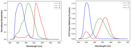 Normalised sensitivity functions of Nikon D5100 camera (left) and the CIE XYZ standard observer colour matching functions (right). The XYZ matching curves are relative to ‘Y’ (green curve) which has a maximum response of 1.
