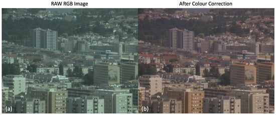 An illustration of colour correction. The images are generated from David Foster’s hyperspectral reflectance dataset [3] with Nikon D5100 camera responses and D65 illumination. The left one (a) demonstrates the RAW RGB image; the right one (b) represents the colour-corrected sRGB image.