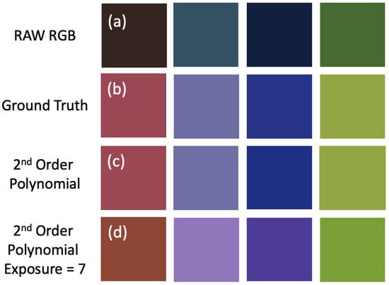 Now, we multiply the Nikon RGBs and the corresponding sRGB triplets by 7. As before, we calculate the second-order polynomial expansion of the RGBs and then apply the same colour correction matrix for the exposure = 1 condition. After colour correction, we again scale to make the exposure (across all three channels) equal to 1. The resulting colour patches are shown at the bottom of Figure 3. It is clear that the colours of the patches have changed significantly and that the colour correction is more accurate for the colours rendered under the same exposure conditions (panel (c) is more similar to (b) than (d) is to (b)).